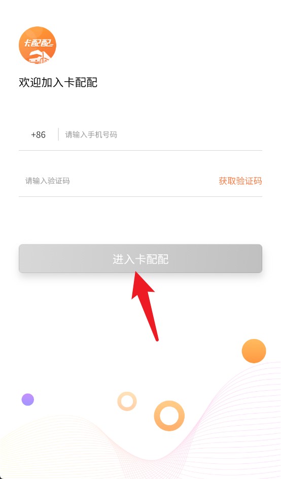 1、打开卡配配App后,先输入手机号和验证码,点击“进入卡配配”按钮完成快捷登录。
