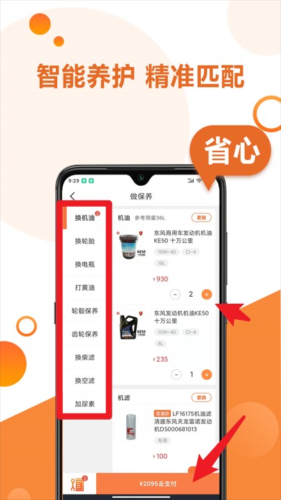 1、智能车辆匹配系统自动识别行驶证数据,精准推荐适配的保养套餐与配件参数,覆盖数千万重卡车型数据库。