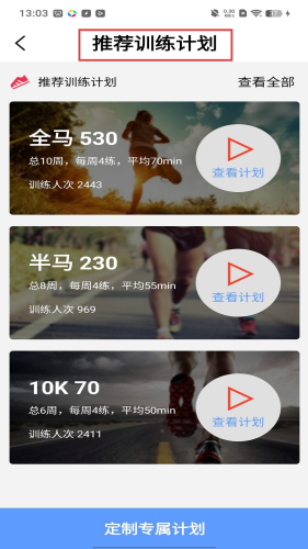 2、在首页找到定制专属计划或相关入口,进入推荐训练计划页,浏览全马、半马等训练方案。