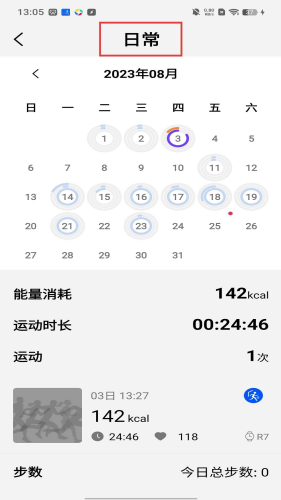 3、切换至运动数据模块,找到日常分类,进入查看当月日历形式的运动记录、能量消耗等数据。