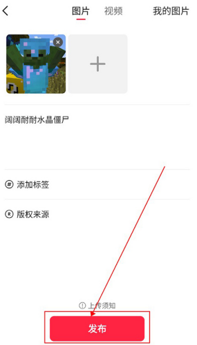 3、需要再填写好图片或视频的内容描述以及标签或来源,点击右上角的“发布”即可。