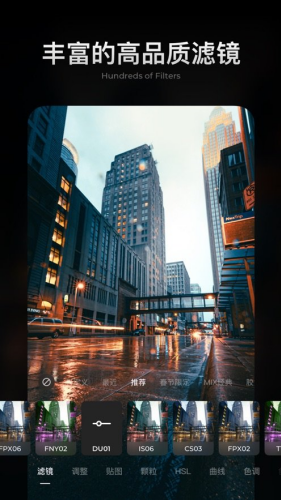 1、超过130个高品质、免费内置滤镜,涵盖从专业彩色反转胶片到电影色调等多种差异化风格。