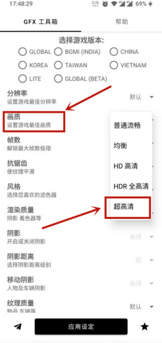 2、在设置画质的时候,其中最底端的“超高清”选项提供的画质最高,对自己手机性能有信心的朋友建议选择这一项。