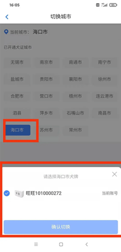 2、注册登录 完成犬卫士的注册后,在所在城市选项中选择“海口”,这样就能同步犬牌、犬证信息。另外,犬牌与手机进行连接时,大概需要30 - 60秒的时间。首次对接时,需GPS犬牌接收到卫星信号,之后才能在“爱犬位置”处显示地图以及犬只坐标。