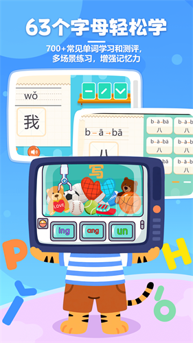 儿童学拼音软件免费版是一款为3至6岁儿童设计的拼音启蒙手机应用,精准对接幼小衔接阶段的学习需求,课程内容覆盖23个声母、24个韵母、16个整体认读音节及全部声调规则,并融入57个字母的标准发音与笔顺书写训练,帮助孩子从零基础稳步入门。这款APP让学拼音变得像玩游戏一样有趣,把复杂的汉语拼音拆解成一个个生动的小任务,孩子可以在森林冒险、太空探索或动物乐园等主题场景中,边点读字母边练习发音,在闯关中掌握23个声母和24个韵母的组合规律。儿童学拼音软件免费版不仅提供标准发音点读和规范笔顺演示,还通过游戏化机制强化记忆,如拖拽配对、语音跟读、闯关挑战等,激发儿童主动参与的兴趣,通过400多个常用汉字与词语的拼读练习,结合16款孩子喜爱的益智小游戏,将枯燥的拼音知识转化为趣味互动体验。整个学习节奏舒缓友好,真正实现“玩中学、学中会”,让拼音启蒙既高效又充满欢笑。