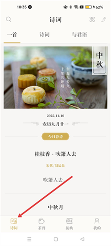 1、进入诗词界面,可查看今日荐诗,如宋代刘辰翁的桂枝香吹箫人去,还可切换至一首、与君语板块,底部有诗词、茶刊、韵典、我的功能入口。
