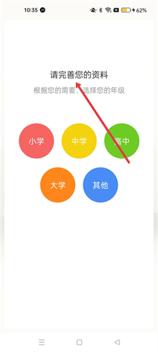 4、登录后需完善资料,根据需求选择小学、中学、高中、大学、其他年级分类,完成后可获得更贴合需求的诗词内容推荐。