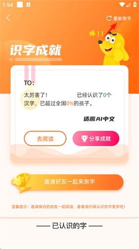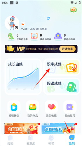 1、打开适趣AI阅读APP,点击【我的】-【识字成就】;