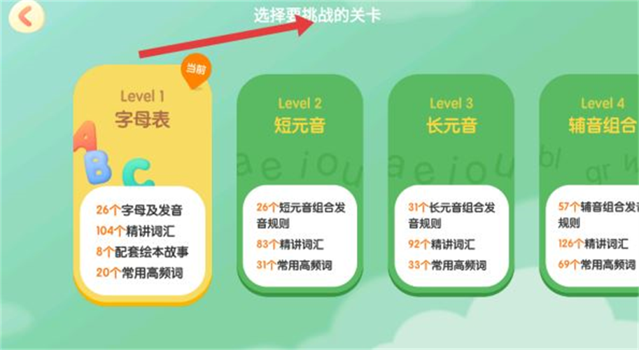 3、关卡选择界面展示四级学习挑战,Level1字母表涵盖26个字母发音、百余个词汇等资源,后续等级逐步拓展短元音长元音及辅音组合,构建系统拼读学习体系。