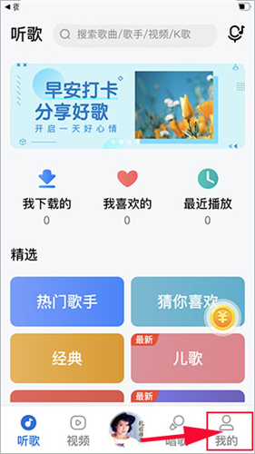 1、在本站下载好软件打开,我们会看到软件下方有听歌,视频,唱歌,我的,选项。