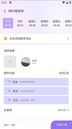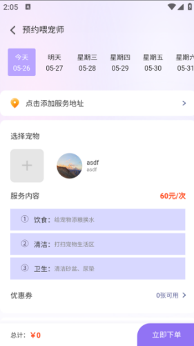 3、预约喂宠师,大家可以在这里选择日期,选择宠物,查看服务内容。