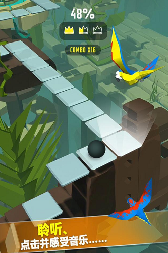 1、人上瘾的节奏型游戏方式,一边听音乐、一边点击屏幕躲避障碍物。