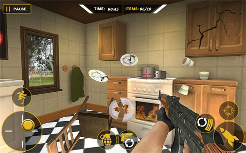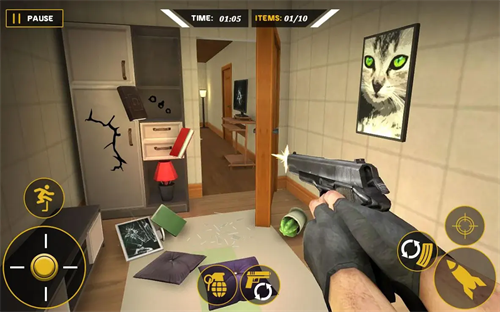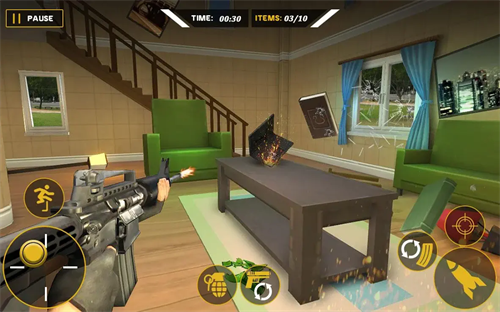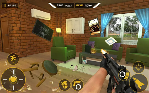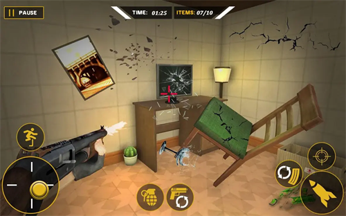 1、在游戏中,操作玩法非常简单,通过左侧的摇杆控制来移动目标,右侧是切换瞄准与射击的按钮,通过寻找当前关卡内指定的物品,进行搜索与破坏。