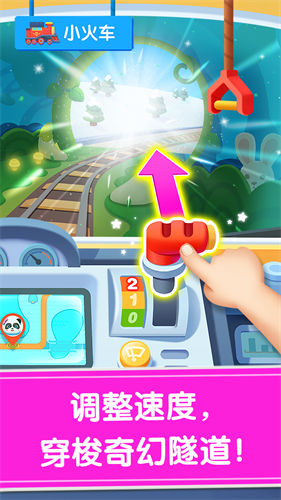 拉闸、鸣笛,“呜”——小火车发车啦。宝宝把档位调至二挡,沿着轨道加速前进。瞧,小火车经过了皑皑雪山,广袤草原,又驶向浩瀚沙漠……“前方到站,沙漠滑坡”。