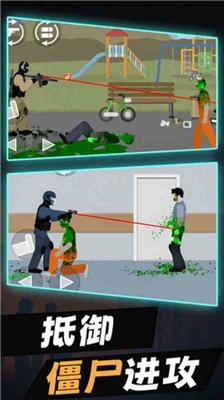 2.在游戏中,玩家要面对周围的僵尸军队,拿起你唯一的武器射击僵尸的头部!冲出包围圈,防御僵尸!拿起枪杀死每一个来的僵尸!