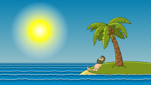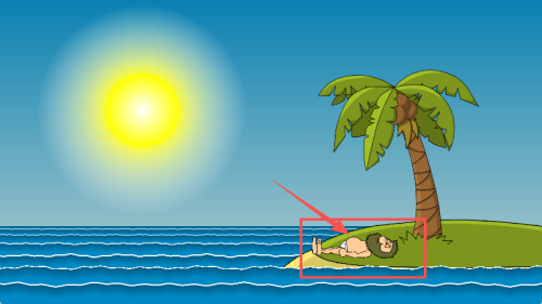 3、看沙滩卡通图,有个裸上身的人在棕榈树小岛晒太阳,阳光明媚海水湛蓝氛围悠闲。