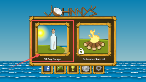 2、在游戏主界面,看木质框架左右分区,左边漂流瓶标30天逃离,右边篝火锁着标耐力生存。