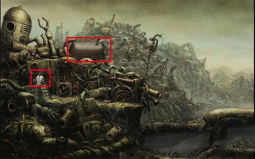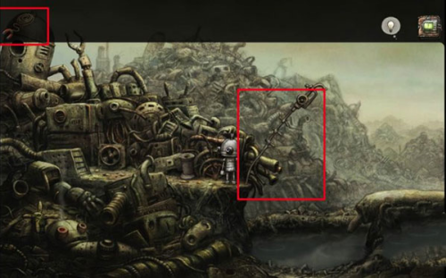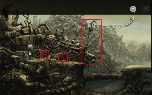 1、打开机械迷城后,可以看到一些介绍,点击图中标红的位置,上面那个盒子下面会出现机器人的身子,左下角是机器人的头,他们会组合成一个机器人;