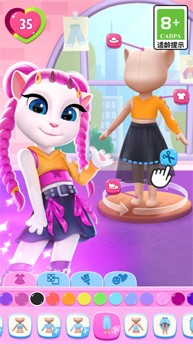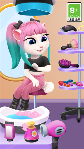 时尚爱好者注意啦:安吉拉有一个专为时尚而设的迷人房间!漂亮的衣柜里满是服装和配饰,巨大的化妆台让你可以畅玩化妆游戏,迷你发廊让你可以尝试各种新发型。帮助安吉拉设计发型,用时尚和美妆来展现自我。
