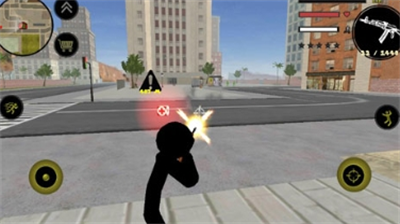 左侧移动、加速,右侧绳索,攻击(跳跃),跳跃,右上侧的武器更换以及血量、经验的显示都实时更新,一览无遗,凭借着大家自由的玩法,与其他帮派的人物进行交火,期间杀人能够获得经验,杀多了会产生星级,警察和其他附近角色会特殊照顾你对你展开火热的进攻,而如何存活,如何将其他人物击杀则是你所需要完成的任务。