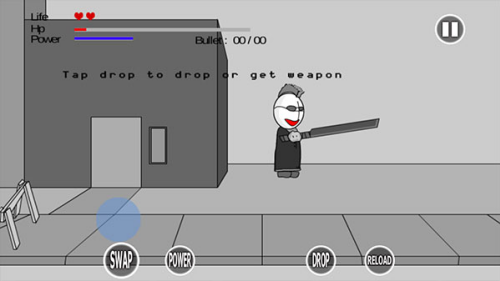 4、进入后左侧屏幕移动蓝色圆圈可以控制角色行走移动,左上角爱心是当前生命值,hp经验,power力气,需要一定时间来恢复,底部是快捷按键,比如Drop就可以释放机械手中所拾取到的武器;