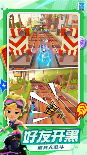 subwaysurfers破解版全人物全滑板无病毒是一款趣味十足的休闲跑酷类游戏,游戏采用了3D立体视角,画面更是大胆的采用了绚丽的色彩,这样的画面不仅没有让玩家产生反感,反而在跑酷游戏中画面都是高质量的,给玩家一种视觉上的强烈享受。游戏中玩家扮演的角色将躲避列车管理员和他那只狗的追击,并在铁路见飞快穿梭收集金币。同时,地铁跑酷玩法十分丰富,首先提供了大量的游戏道具供玩家自由使用,每种道具所带来的游戏增益都不一样,其次游戏内模式种类众多,玩家不仅可以与好友展开一场较量,还能在各种模式当中挑战自己的极限所在。