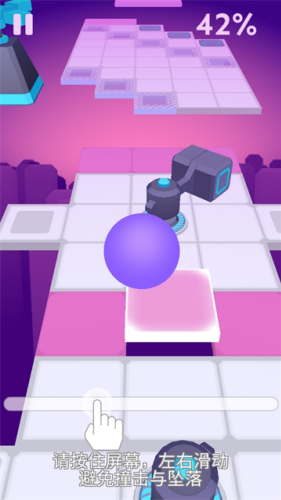 1、控制球球的左右移动,小心翼翼的避开障碍物,凝视前方迅速的破解新的关卡。