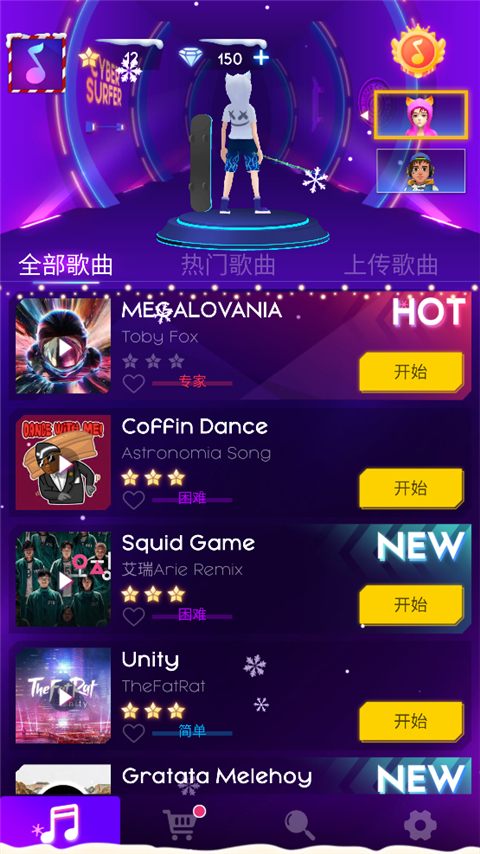 7、返回主页面,挑选“全部歌曲”“热门歌曲”或“上传歌曲”,自由选择你最爱的旋律开始挑战。