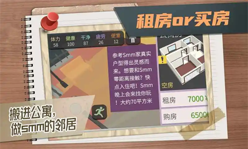 够1000r租房之后,回到出生点,走到这个位置,点离开,不用管那个老太太,两个屋子只有一间可以租,点击租房,是一个月的,然后就可以进去了,可以看到有很多家具,游戏也就进行到前期的阶段了,每个月会自动扣除1000租金,不够钱的话又要留宿街头了,不会结束游戏,赚钱还是先按照上面所述的方法赚,攒多点再尝试别的赚钱方法,记得要稳一点哦