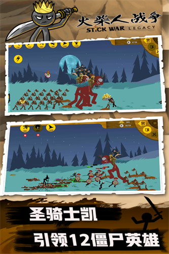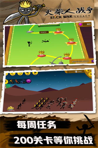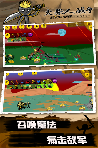 1、游戏中玩家将亲临激烈刺激的战场,指挥你的火柴人勇士进行作战,而且游戏中有着各种火柴人士兵可供训练。