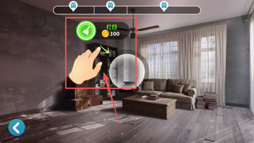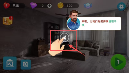 4、点红色边框内绿色圆形打扫按钮,用300金币开始清理房间杂物任务。