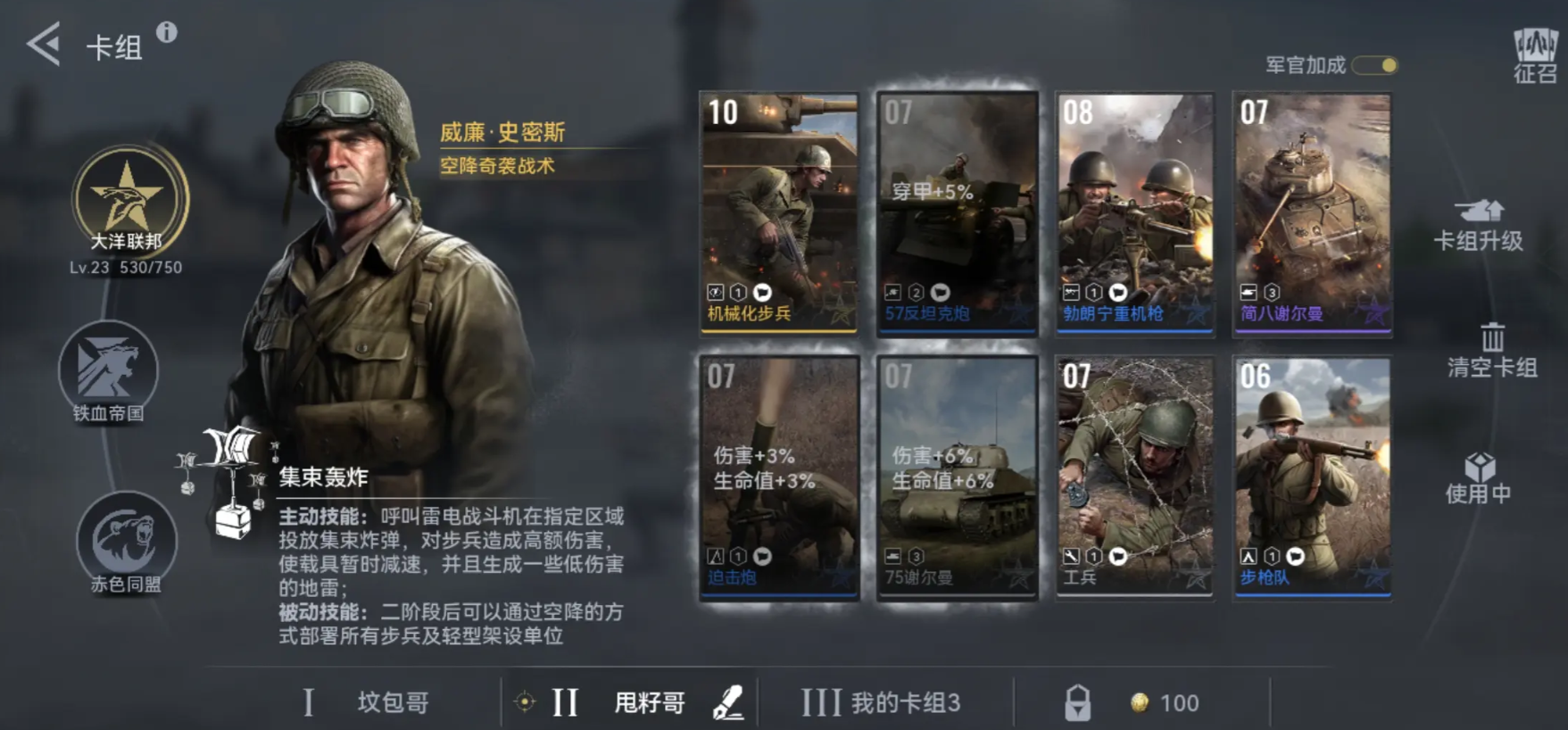 2、军官专属技能如“装甲突破”“战地医疗”可改变战局,搭配小队形成组合技。