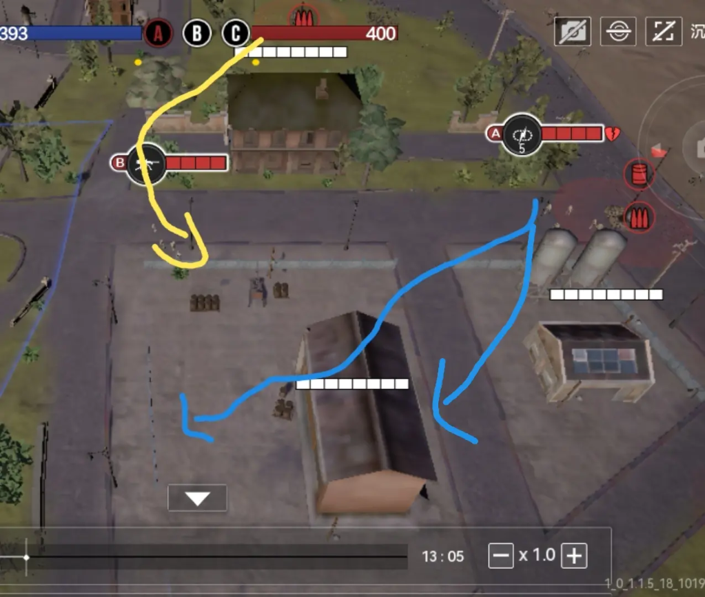 因为机枪占领的黄点离家比较近,所以他一定是先占领的,占领完从上面白房子右侧贴边走到仓库南墙根,机械化走到仓库后面看一眼再走到仓库东边墙根,工兵开技能挖沙包直走对面油点,这样做有三个好处,第一个是此时的时间能判断b点的信息,对面有没有选择占领?