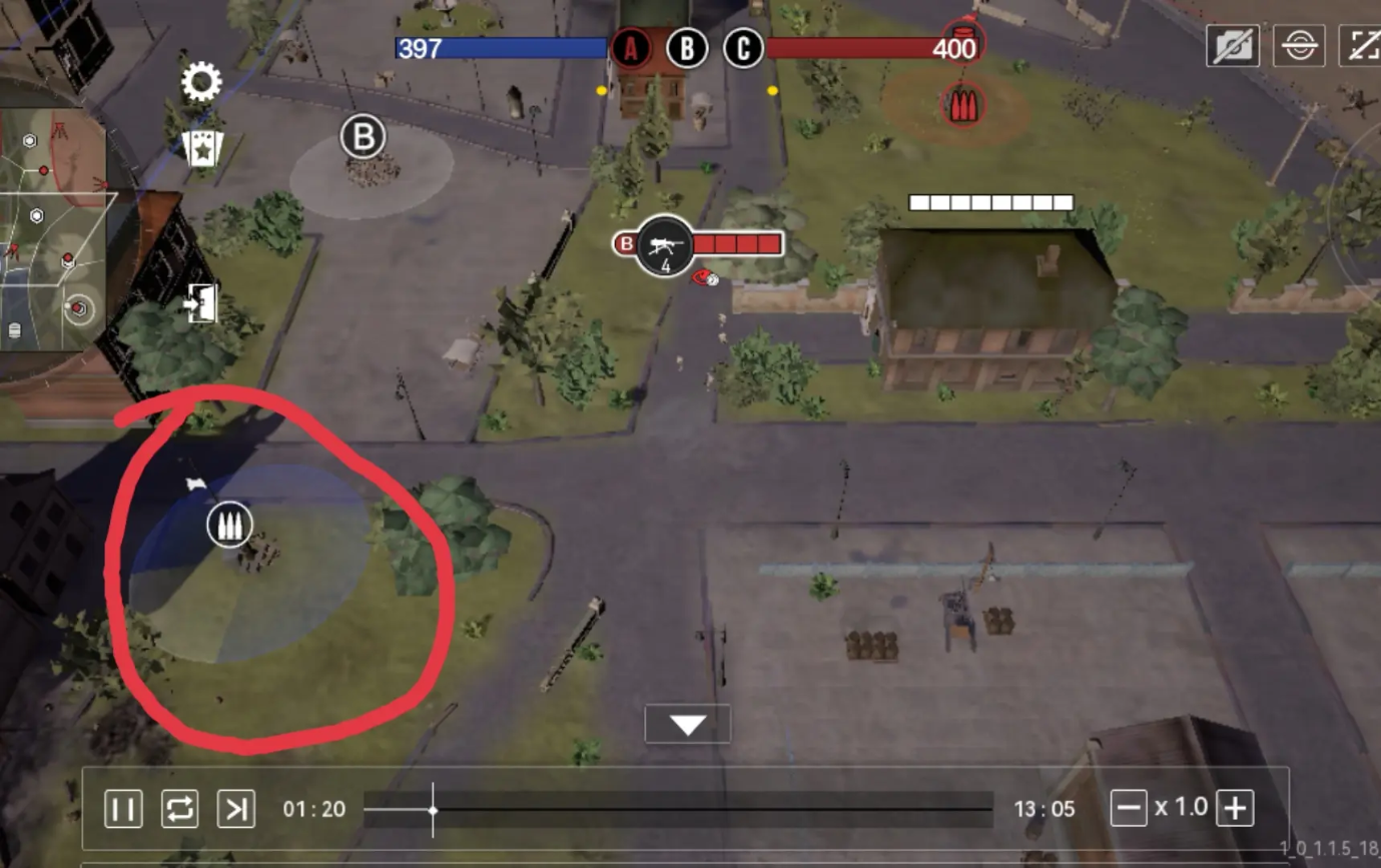 第二个是在不暴露自己的情况下可以看到对面弹药点的占领情况,一般来讲从黄点走到墙根的半路上能看到弹药点正在占领,不要管他等待机械化就位以后再走