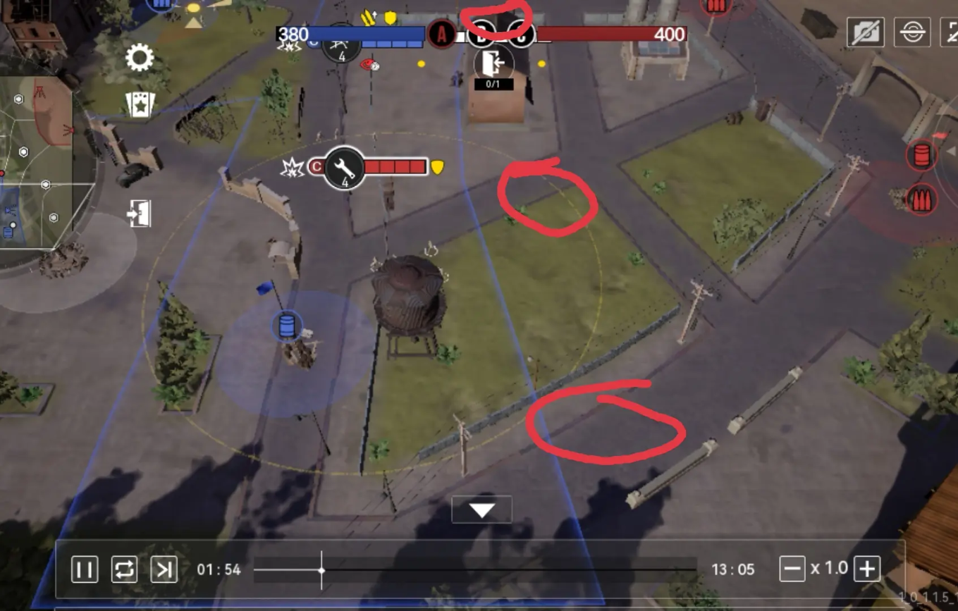 此时时间2:53.不到三分钟,我是红方右侧,对面另一队支援弹药点,我刚刚被打退,队友顺势拿对方黄点,机枪可以选择回架左边蓝点或强攻弹药点,等我重新回到前线,他们右边的人刚好回防左边,兵不血刃再次拿回右边蓝点,顺势包抄油点和弹药点,哪怕我二本一个兵不出,他3本坦克出现之前b点绝对拿不回来,战线一定在弹药点和黄点之间拉锯