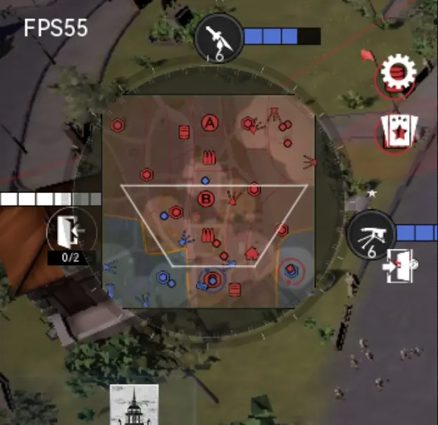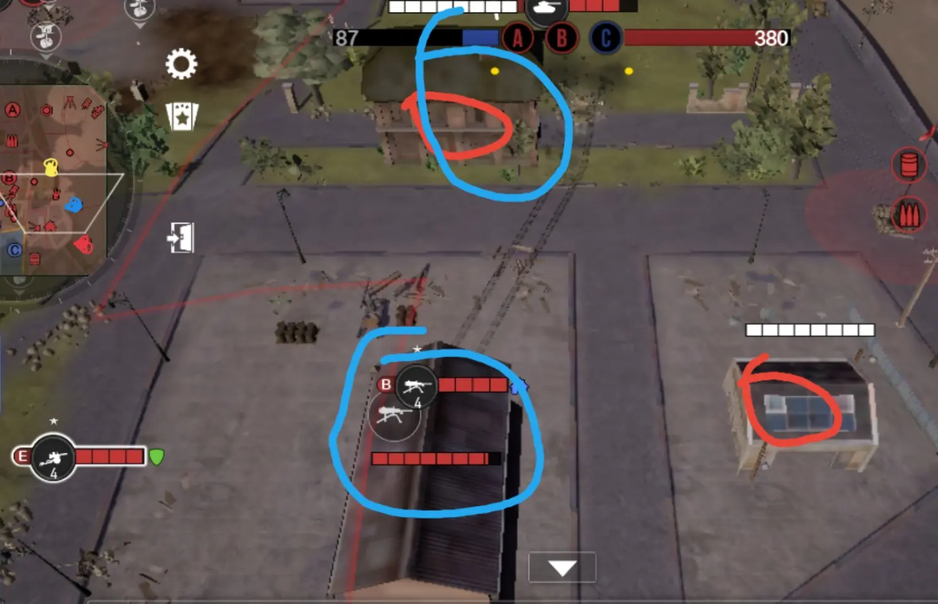 小地图如果红点被占领,两个机枪就在红的圈的房子架,没被占领,就在蓝色房子架,被炮打换房子架,等炮再停回来,10分钟以后,无论红点有没有被占领,反攻只占领到蓝色点,红点就算被占也不管了,兵力全用来正面战场绞肉