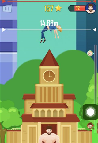 1、游戏玩法很简单,把怀中的男人扔上去,落下来后在接住继续往上人,一次比一次扔的更高,但是不要让他掉到地上。