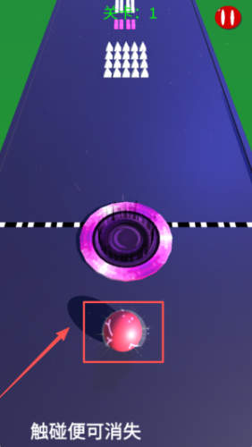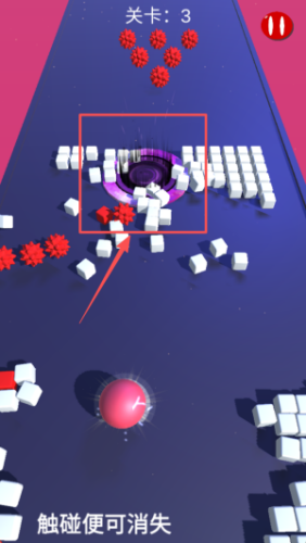 2、进入第一关后,控制红色球体避开白色尖刺,通过触碰方式让障碍物消失,顺利进入紫色通道。