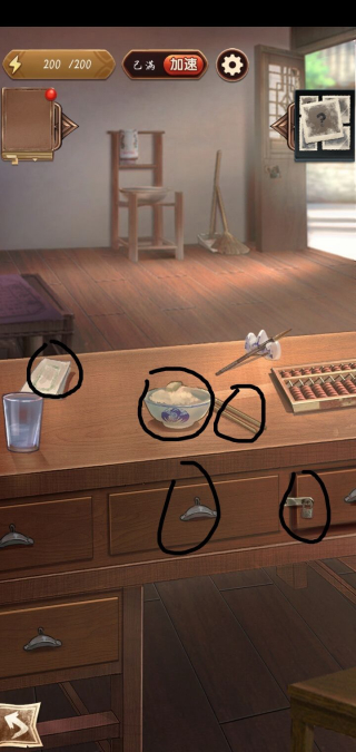 2、点击桌面下面的锁可以得到抽屉上的锁还有中间抽屉的一叠汇票,在桌面上可以获得借据、一双竹筷、一碗白饭。