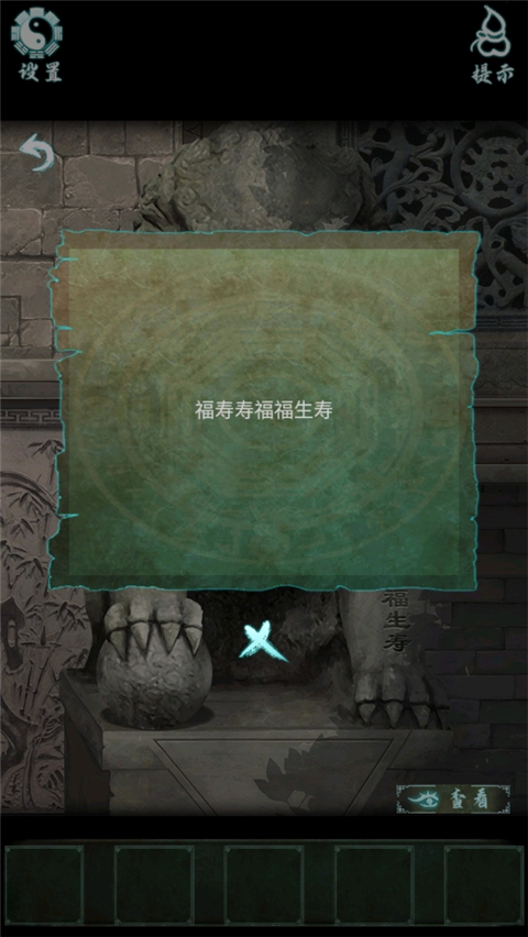 1、进入场景后,先点击门口右侧的石狮子,按照提示依次敲出“福寿寿福福生寿”,大门即可开启。