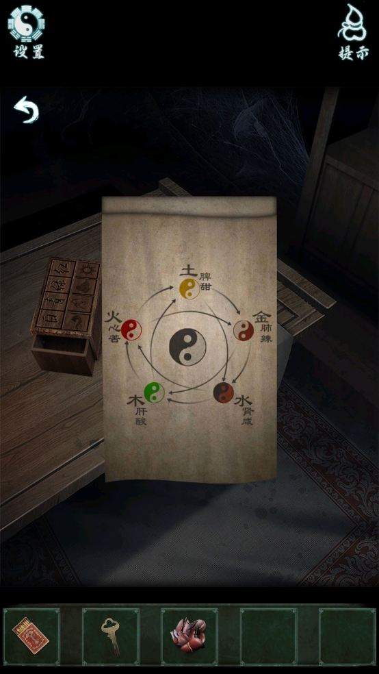 3、将圆形按钮装回盒子机关,依据线索完成转盘解密,拿到五脏纸扎。