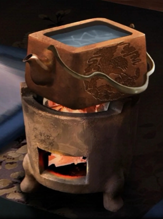 7、返回主屋,将热水倒入杯中并放入茶宠,根据茶宠提示解开桌上盒子的机关,得到青花瓷球。