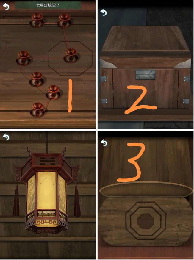 12、来到棺材前,点燃七星灯并悬挂灯笼,获得最终八卦提示。按“上九下四”拨动八卦盘。