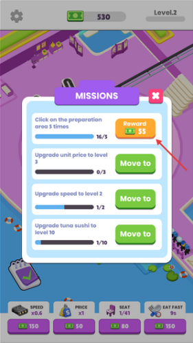 4、完成指定任务后,进入任务界面领取Reward 55金币奖励,可用于升级厨房设备或解锁新菜谱,推动餐厅发展。