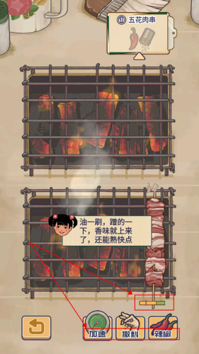 3、之后就可以制作美味烤串啦,玩家需要根据烤串下方进度条,合理调整速度,添加调料。