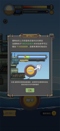 4、猎物会在上方的蓝色区域内左右移动,当猎物处于绿色判定框内时点击收竿可以增加下方的进度条,进度条满则钓鱼成功