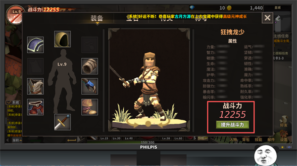 9、装备界面可查看角色的属性和战斗力,点击 “提升战斗力” 可优化装备等提升战力。