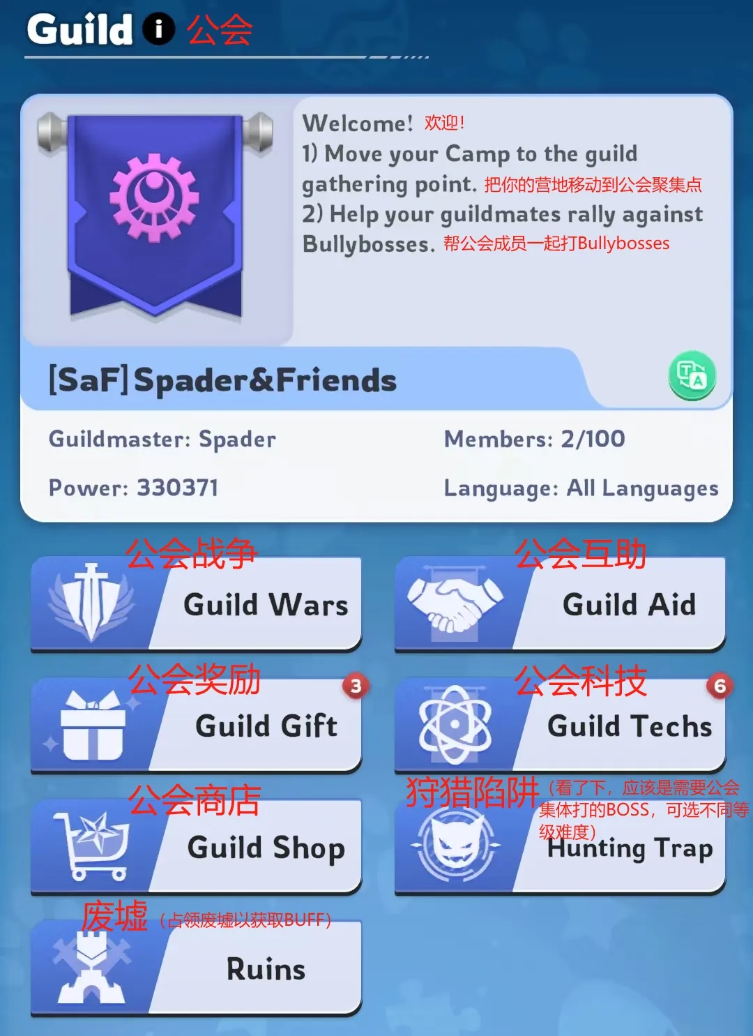 4、就公会菜单来看,需要玩家合作完成的PvE、PvP内容应该都是有的。而且公告里写了让玩家把营地移至公会聚集点,这句话可能也意味着帕尔蒙生存公会团战有沙盘策略要素。