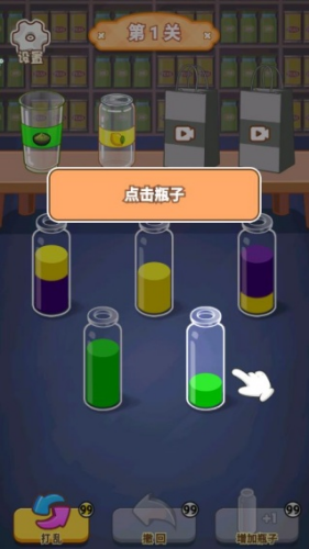 1、通过点击选择的瓶子,再点击目标水杯进行倒水操作,将同色液体汇集到同一容器。