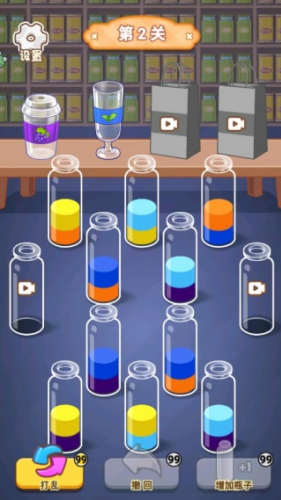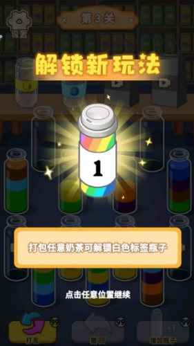3、每将一个同种颜色的水放到一个瓶子里面以后,玩家可以解锁新的奶茶。